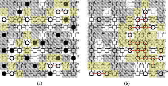- The BDS adopts the few-elite strategy and randomly sends 10 white-hat worms to observable nodes, i.e., . Figure 9a shows an example of the state at . Assume the white-hat worms have the capabilities below.