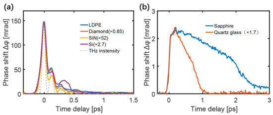 Figure 2a shows the measured TKE responses of diamond (300 μm), low-density polyethylene (LDPE) (300 μm), Si3N4 (200 nm), and silicon thin film (10 μm) in which the THz intensity curve () is also shown for comparison. The TKE response curves and traces of have similar shapes. However, the TKE responses of the sapphire (0.5 mm) and quartz glass (0.5 mm) shown in Figure 2b have significantly different characteristics.
