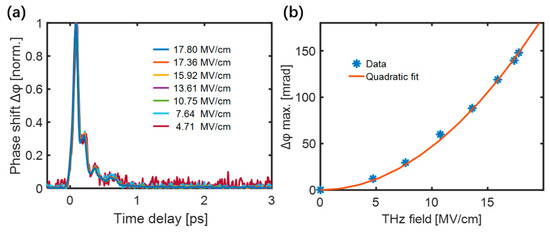 The maximum value of the transient birefringence was proportional to the square of the THz electric field for all samples. The normalized TKE responses of the low-density polyethylene (LDPE) excited by different THz electric field strengths are shown in Figure 3a. Figure 3b shows that the peak values of the responses were quadratically dependent on the THz electric field, proving the dominance of THz-induced third-order non-linear Kerr effect.