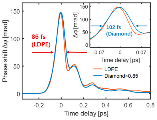 However, the measured TKE response could not completely follow the intensity curve of the input THz electric field. In particular, the quartz glass and sapphire shown in Figure 3b had wider response times. This is because Equation (2) describes the local relationship in an ideal section without considering the propagation of the THz and probe pulses inside the sample. In addition, the probe pulse had a pulse width. Therefore, signal acquisition was accompanied by sampling distortion resulting from the medium dispersion, refractive index, absorptivity, and thickness. LDPE is an ideal sample for THz wave-driven ultrafast non-linear effects owing to its large bandgap, small dispersion, and high THz transmittance. Diamond typically achieves ultrafast pulse switching on a femtosecond timescale [53]. The TKE responses of LDPE and diamond with the same thickness of 300 μm were measured and compared under the same experimental conditions. The two response curves exhibited similar temporal shapes, as shown in Figure 4. Compared with the ~102 fs gate time of diamond, LDPE exhibited a faster gate time of ~86 fs (FWHM) [51,54].