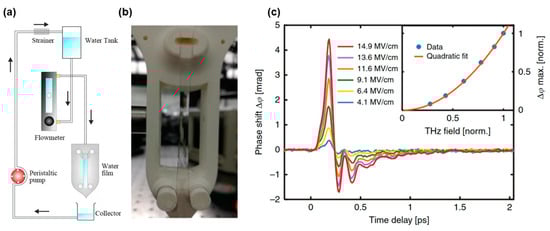 Therefore, gravity-driven free-flowing liquid devices have been exploited to generate thin, continuous, and stable water films [83]. Schematics and images are shown in Figure 5a,b, respectively. Figure 5c shows a set of bipolar signals with clear oscillatory properties of water excited by different THz electric field strengths. The responses were scaled with the square of the THz electric field, as shown in the inset, suggesting the dominance of Kerr effect. The broadband THz pulses excited two intermolecular motion modes: hydrogen bond bending and stretching vibrations. The positive signal was attributed to the hydrogen bond stretching vibration, and the negative signal was due to bending vibrations. Polarizability perturbation presents the competing contributions of the bending and stretching vibrations.