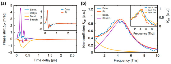 where and represent the damping coefficients and frequencies of the hydrogen bond bending and stretching modes, respectively. In Raman spectroscopy, the typical values are: 3.45, 1.80, 5.10, and 5.70 THz [62,63]. Here, represents the coupling factor between the square of the THz electric field and driving term in Equation (4). As shown in Figure 6a, the experimental data were decomposed and simulated into (i) positive responses of electron (blue line) and hydrogen bond stretching (purple lines) contributions and (ii) negative responses of Debye relaxation (red lines) and hydrogen bond bending (yellow lines) contributions [1]. This was verified by changing the THz frequency bandwidth using different low-pass filters. The simulation results agreed with the measured data. The positive response mainly originates from high-frequency molecular motion. This weak electron contribution can be attributed to the small hyperpolarization in water [2,84]. The frequency-domain Kerr coefficients Keff () were extracted from three excited THz pulses with cutoff frequencies of 18, 9, and 6 THz, as shown in Figure 6b. The Kerr coefficients mainly originate from the intermolecular modes. A prominent resonance peak appears around 4.5 THz, which corresponds to the hydrogen bond stretching vibrational mode. The hydrogen bond bending vibration is approximately a critically damped harmonic oscillator, resulting in no obvious peaks. The Kerr coefficient (blue line) can be approximated by the total contribution of the two intermolecular modes (red line).