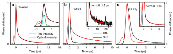 Sajadi et al. [5] analyzed the collective orientation and relaxation dynamics of molecules on a sub-picosecond timescale by measuring the anisotropy of liquids, such as toluene, dimethyl sulfoxide (DMSO), and chloroform (CHCl3), driven by THz waves. The measurement results are shown in Figure 7. The TKE and OKE responses were compared in detail. The THz field-induced transient optical birefringence was more than one order of magnitude higher than optical excitation. This enhancement highlights the significance of THz field coupling to the permanent molecular dipole moments.