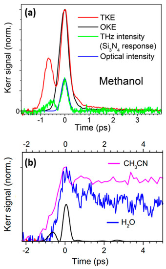 Kampfrath et al. explored the molecular dynamics of alcoholic liquids [3]. They successfully measured the transient TKE response of methanol, as shown in Figure 8a. The rising peak was mainly attributed to the electronic contribution. Additionally, the relaxation of several picoseconds, resulting from the molecular response. This signal feature showed weak coupling between the THz electric field and permanent molecular dipole moment of the liquid.