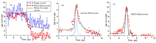 (a) TKE signals of water, (b) acetone, and (c) chloroform (red circles). The black lines represent the fitting curves [78]. Solid lines—theoretical calculation. Dotted and dashed lines in (b) show fast and slow Kerr responses, respectively. Dotted line in (c) traces THz pulse intensity.