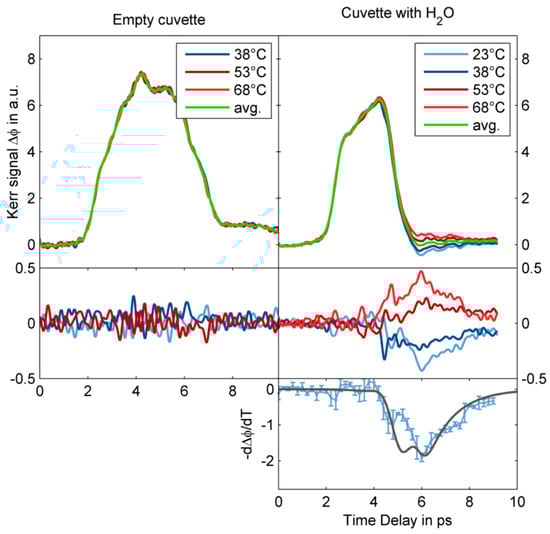 Zalden et al. observed the transient orientation of the dipole moment of liquid water excited by a single cycle THz pulse centered at 0.25 THz generated from lithium niobate. Owing to the large TKE response of the sample cuvette, they extracted the response curve of water by changing temperature [2]. Figure 10 shows the TKE of water in a cuvette measured at various temperatures between 23 and 68 °C. Owing to the temperature independence of the electronic Kerr effect, the temperature-dependent signal originated from the molecular Kerr effect of water. The resulting (blue) curve agrees with the molecular contribution to the Kerr effect derived from modelling of the experimental data (black curve).