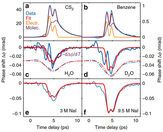 - Zalden, P.; Song, L.; Wu, X.; Huang, H.; Ahr, F.; Mücke, O.D.; Reichert, J.; Thorwart, M.; Mishra, P.K.; Welsch, R. Molecular polarizability anisotropy of liquid water revealed by terahertz-induced transient orientation. Nat. Commun. 2018, 9, 2142. [Google Scholar] [CrossRef] [PubMed]
