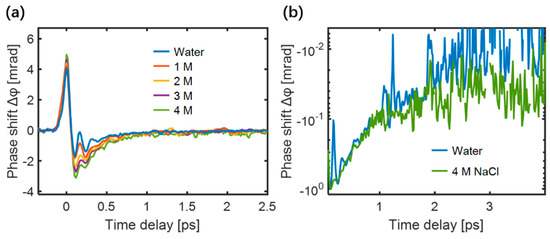 The TKE responses of NaCl aqueous solutions were measured, as shown in Figure 12a. As the ion concentration increased, the characteristics of the TKE response exhibited three evident changes: (i) the response amplitude increased, (ii) the relaxation time increased, and (iii) the oscillation characteristics gradually smoothed. The normalized negative polarity responses of water and 4 M NaCl solution displayed a slight difference in the responses after 1 ps, as shown in Figure 12b, proving that the ions slow the recovery time of the water molecular motions.