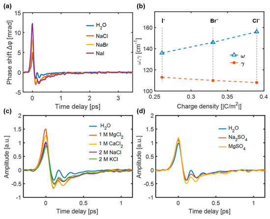 The TKE responses of the aqueous halide solutions were measured and are shown in Figure 13a. For the same concentration, the positive TKE response amplitude evidently increased in the order Cl− < Br− < I−, along with a decrease in the surface charge density of the anion. Notably, the NaI solution exhibits a higher anisotropic response because, for anions with low surface charge densities, such as I−, the formed OH···I− hydrogen bond has a longer bond length and lower binding energy than the OH···Cl− and OH···Br− hydrogen bonds. The simulated inherent frequencies and damping coefficients of the OH···X− (X−: Cl−, Br−, I−) hydrogen bond vibrational modes based on TKE spectroscopy are shown in Figure 13b. The obtained inherent frequencies and damping coefficients are consistent with the results obtained by non-resonant OKE spectroscopy [86]. Figure 13c shows the TKE responses of 1 M aqueous solutions of CaCl2 and MgCl2 and 2 M aqueous solutions of NaCl and KCl. Even though the molar concentrations of K+ and Na+ were twice those of Ca2+ and Mg2+, the increase in TKE response amplitude could still be arranged in the order of K+ < Na+ < Ca2+ < Mg2+. This implies that the effect of the cations on the TKE response was smaller than that of the anions. Figure 13b shows the TKE responses of 1 M Na2SO4 and MgSO4 aqueous solutions. The influence of Mg2+ was greater than that of Na+, even though the molar concentration of Na+ was twice that of Mg2+. This implies that the THz field couples more easily with the rotational and restricted translational motions of water molecules under the influence of strongly hydrated ions, such as in MgSO4 solution.