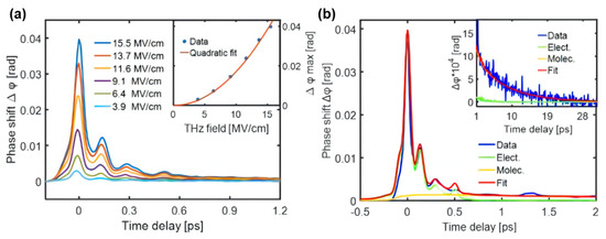 Ethanol is considered a representative molecule for investigating intermolecular interactions in biochemical processes. Exploring molecular motions in ethanol–water solutions with different mixing ratios is crucial for understanding the hydrogen bonding dynamics [88,89,90]. Figure 14a shows the TKE responses of ethanol excited by different THz electric field strengths. The signal has two characteristics: (i) a large response peak on a sub-picosecond timescale, and (ii) a slow decay process extending to tens of picoseconds. Usually, features (i) and (ii) mainly originate from the electronic and molecular responses, respectively. The simulated electronic response to ethanol [91] is indicated by the green line in Figure 14b. Moreover, the sum (red line) of simulated two kinds of responses is in good fit with the measured data (blue line). This means that the electron contribution plays a major role in the evolution process of sub-picosecond time scale, while the molecular contribution is dominant in the tens of picoseconds.