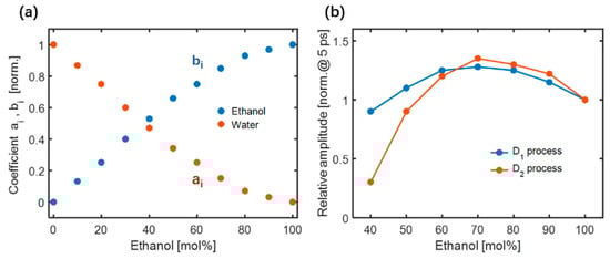 (a) The relationship between different molar concentrations and coefficients and within the sub-picosecond. (b) Relative amplitudes of the two Debye relaxation processes in mixtures of different molar concentrations [91].
