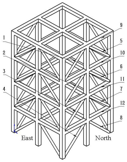 The model studied in this paper is a four-story steel frame structure was built by University of British Columbia [42]. Its 3D model is shown in Figure 1. It can be seen from Figure 1 that it is divided into four sides: south, east, north, and west, each side has the same structure distribution and the same location has the same code. Fifteen acceleration sensors were placed on the steel structure model. Starting from the first floor, three acceleration sensors were installed on each floor: one on the west side, one on the east side, and one near the center column. The acceleration sensors numbered No 1~No 3 were placed on the foundation of the bottom layer; the rests were placed on the top of each layer. Nine damage cases of frame structure can be simulated as shown in Table 1.
