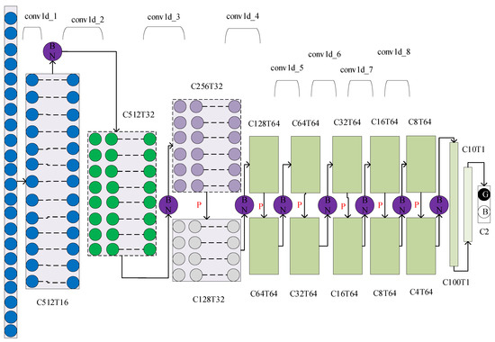 In Figure 3, P represents Max-pooling, C represents the length, T represents the number of channels, G represents the good type, and B represents the bad type. After each pooling layer in ITICNN, the BN operation was used; the BN layer can standardize the data to enhance the recognition ability of the network.