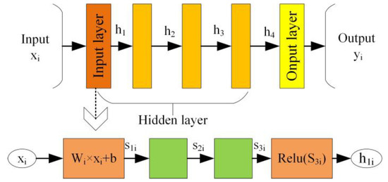 where n is the length of mini-batch in the BN; Xi is the ith input; S1i, S2i, and S3i are the ith output of the 1st, 2nd, and 3rd hidden layers; Wi is the ith weight of BN operation in this layer; b is the offset; and are the expected and variance of a small batch input, respectively; is a decimal that tends to 0, but it cannot be set to 0 because when it is equal to 0, Equation (9) does not hold; γ and β are the parameters to be learned.