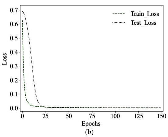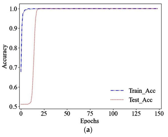 It can be seen in Figure 7 that the accuracy of training and testing increases rapidly when the training epoch reaches 25; it is close to the stable value when the training epoch reaches 40, and it is stable at 100%. At the same time, the objective function value (loss) also drops very fast, when the training epoch reaches about 30 the objective function value tends to be stable. When the training epoch reaches 80 the objective function curves of training and testing coincide, when the training epoch reaches 100 the objective function value drops to 10−5. The following conclusions can be drawn from Figure 7: