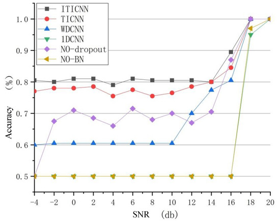 The comparison results are shown in Figure 9. It can be seen from Figure 9 that ITICNN’s anti-noise ability is about 3~4% stronger than TICNN, the anti-noise ability of TICNN is 28~30% greater than WDCNN, and the anti-noise ability of ITICNN is 30~32% stronger than 1DCNN. At the same time, it can be clearly seen from the figure that when the Dropout layer is not used the anti-noise ability of the model proposed in this paper is reduced by 20~25%, when the BN layer is not used the accuracy of the model proposed in this paper is reduced by 30–35%, which basically coincides with the result of 1DCNN. It can be concluded that BN layer is the key to improve the anti-noise ability of ITICNN. At the same time, adding a Dropout layer between the first large convolutional layer and the second convolutional layer can improve anti-noise ability of ITICNN. Therefore, ITICNN is superior to TICNN, WDCNN, and 1DCNN in terms of anti-noise performance.