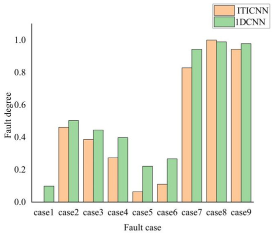In order to verify the advantages of the network model proposed in this paper, under the same conditions the 1DCNN proposed by Abdeljaber et al. in 2018 was used to conduct experimental comparative research on the frame structure, and histogram of the comparison results between ITICNN and 1DCNN was obtained, as is shown in Figure 10.