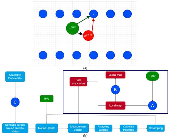 Workflow architecture describing our proposed method. (a): Describing the vehicles true position (in red), IMU’s position (in blue) and objects in the vehicles environment as picked up by the LiDAR (in blue). (b): The structure of the proposed approach consists of two main steps: data processing {features extraction (A) + global mapping (B)}, described within the dark blue rectangle, which is a framework for LiDAR measurements processing and creating local and global maps. Secondly, localization (C) using adaptive particle filters.