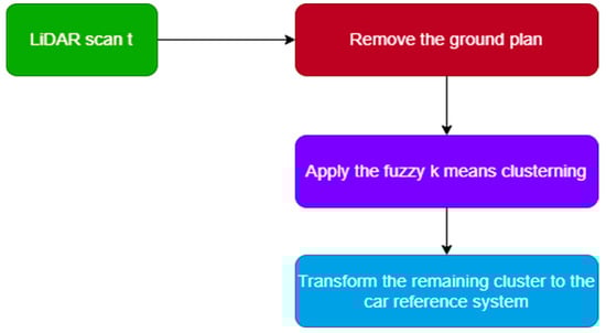 The features extraction step, which corresponds to step (A) in Figure 1b, was performed to treat the massive amount of LiDAR data points in order to speed up the localization task and create a lightweight feature map. In this stage, each LiDAR scan, as shown in Figure 2a, is processed as follows. Firstly, we removed the ground plan by excluding points on the z-axis of the scan less than 0.1 m, as shown in Figure 2b, as the ground plan does not contain distinguishable features that could help in the matching process and adds to the computational complexity of the approach. Secondly, we applied a Fuzzy K-means clustering to the remaining points and extracted central clusters representing our local feature map, as shown in Figure 2c. In contrast to semantic features, our features are capable of representing less textured environments, such as poles, trees, roads, and curves, without knowing which cluster corresponds to semantic shape features, e.g., poles or trees. We chose to use Fuzzy K-means due to its ability to obtain clusters of different shapes and sizes and reduce the information of a group of points to a central cluster, which is very important for fast interaction within the framework. Moreover, in Table 1, we demonstrate its speed by testing different clustering methods on sequence 0001 from the Kitti data set []. A flowchart of the following process is provided in Figure 3, underpinned by an illustration in Figure 2.