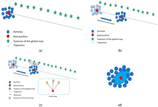 Explanation of the workflow of the particle filter (the images are not real; they are generated to explain the process in depth). (a) Generate particles. (b) Applying IMU transformation. (c) Compare the distances of the particles with the futures of the global map (features in green) and the real distance. (d) Resampling stage, where we regenerate particle around the closest one (particle in-cyan color).