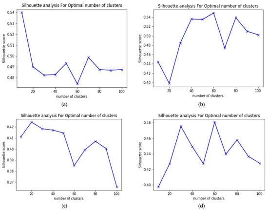 Silhouette values registered by fuzzy K-means algorithm for different cluster numbers in sequences 0001, 0034, 0027, and 0053 from the Kitti dataset. (a) Silhouette values in sequence 0001. (b) Silhouette values in sequence 0034. (c) Silhouette values in sequence 0027. (d) Silhouette values in sequence 0053.