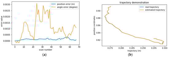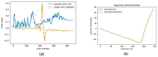We studied in depth the results of sequence 0009. In Figure 7a,b, we mapped the position and angular error variations in each scan, allowing us to make some relevant observations. We found that acceleration mainly affects the accuracy of positioning. From scan 0 to 20, the period in which the vehicle takes off, and from scan 110 to 170, the period in which the vehicle slows down when taking a turn on the road (Figure 7b). In both periods, the error varies from 0 m to 0.25 m and back to 0 m, which means that the particles need time to adapt to the new acceleration of the vehicle.