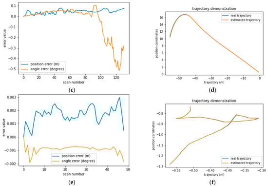 Graphical display of the average absolute position and angular error relative to the vehicle path for each sequence. (a) positional and angular error in seq 0009. (b) vehicle trajectory in seq 0009. (c) positional and angular error in seq 0035. (d) vehicle trajectory in seq 0035. (e) positional and angular error in seq 0034. (f) vehicle trajectory in seq 0034.