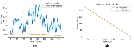 The same is observed in the case of drift or hard breaking, like in Figure 7c,d and Figure 8c,d sequences 0035 and 0027. Therefore, a good positioning model should take into account the velocity to anticipate the vehicle’s motion. Furthermore, we observe that the positioning error is systematically 0.1 m from scan 170 to 250 when the vehicle is turning. However, the angular error recorded high values from 0 to 0.4, indicating the need to determine the turning intensity. Additionally, the same issue was registered in sequence 0034 in Figure 7 and sequence 0053 in Figure 8.