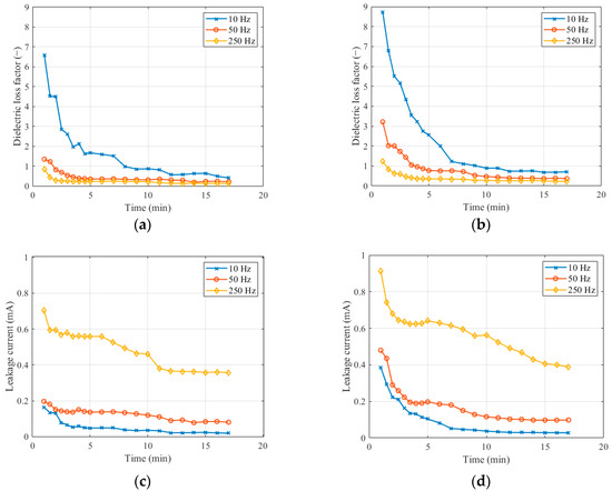 The leakage current had a gradual development when changing the frequency. The leakage current reached the highest values at the frequency of 250 Hz. It stabilized similarly to the dielectric loss factor. When comparing the leakage current, the decrease between the 10th and 15th minutes was 11.5%. Figure 5 depicts the measured data.