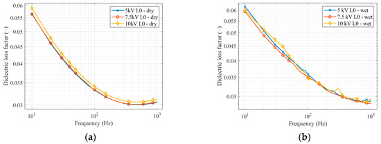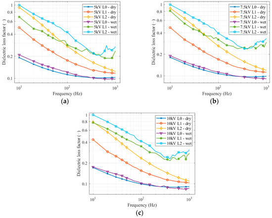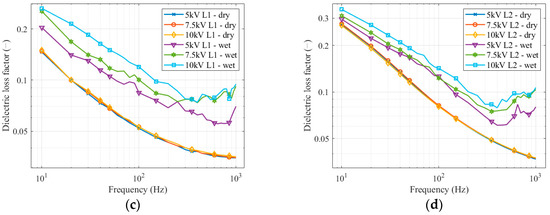 Measurements of the insulator contaminated by the first level of artificial pollution (L1) show a difference between measurements at the dry and wet pollution layers. Measurement on the insulator with a dry pollution layer shows almost identical results for all voltage levels. In Figure 6c, the measurements on the dry, polluted insulator show an average difference between dielectric loss factors at various voltages of 1.05–2.22%. The maximal difference between single values was 3.94% at a frequency of 40 Hz between 5 kV and 10 kV voltage levels. The difference between dielectric loss factors at applied voltage levels increases when measuring on the wet, polluted insulator. From the frequency of 10 Hz to the frequency of 300 Hz, the dielectric loss factor increases with rising voltage. From 350 Hz, measured values for voltage levels of 7.5 kV and 10 kV were almost identical again. The curves are not smooth, as for the dry pollution layer, but the trends of the curves are similar. For the measurement of the wet, polluted insulator at the first pollution level, the average difference between dielectric loss factors in percentage is from 9.76% to 26.8%. The maximal difference between single values reaches 37.38%. It occurs at a frequency of 800 Hz between 5 kV and 10 kV.