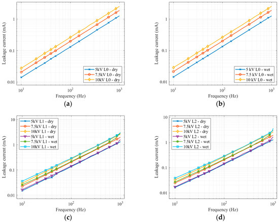 Measurement on the first level of pollution in Figure 8c shows that the leakage current increase is gradual with the voltage increase. The change occurs when measuring with a wet layer of pollution. From the frequency of 500 to 800 Hz, when the leakage current increases rapidly, the difference between the measurement on the dry layer and the wet layer is apparent.