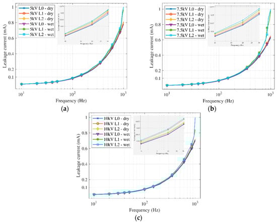 When comparing the results in Figure 9, the differences between the individual measurements are not as significant as they were with the dielectric loss factor. The measured leakage current on wet polluted layers for both pollution levels grows faster, especially at higher frequencies. The most significant difference occurred when measuring at a voltage level of 7.5 kV. The curves for a wet measurement start to increase sharply from the frequency of 600 Hz. A lower difference occurs when applying voltage levels of 5 kV and 10 kV. However, the leakage current is higher than other curves considering frequencies of 900 Hz, 950 Hz, and 1000 Hz. Leakage current curves at these frequencies on wet layers of pollution are separated. The difference between wet pollution layers is minimal. The detailed view in the graphs points out that the individual measurements are graduated, but the difference between them is low. By comparison of average differences between the first and second degree of pollution, the dry layer differs from 1.33 to 2.07%. On the wet layer, the difference is from 1.88 to 2.97%. If we compare measurements on dry and wet layers, the differences are higher (5.7–9.9%) compared with different pollution level measurements. All details on such differences are shown in Table 6.