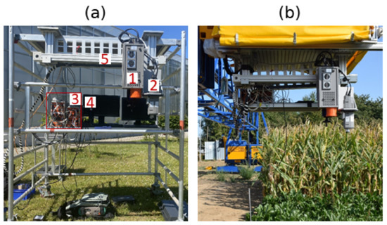 Overview of the HyScreen system: (a) HyScreen mounted on a movable scaffolding with components noted in numbers. Legend: 1. fluorescence sensor (FLUO), 2. visible and near-infrared sensor (VNIR), 3. power and control units (PCUs) and data acquisition computers (DACs) of the two sensors, 4. displays, and 5. linear axis. (b) HyScreen mounted on the mobile field phenotyping platform.