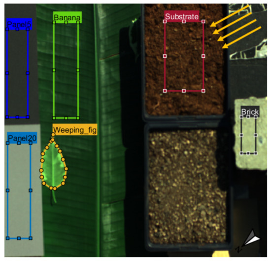 To demonstrate the performance of HyScreen over various vegetation and non-vegetation targets, one scene including several objects was captured at Forschungszentrum Jülich, Jülich, Germany (50.9097° N, 6.41279° W) on 1 April 2020 at 12:13 Coordinated Universal Time (UTC) with sun zenith angle of 43.35° and sun azimuth angle of 192.12°. On this day, the sun’s zenith angle at solar noon (11:38 UTC) was 43.93°. HyScreen was mounted on the scaffolding shown in Figure 1a and placed on a flat lawn area facing southeast with azimuth angle of 130°, avoiding shadows from surrounding objects. The targets were placed on a leveled, black plastic tray. Two reference panels with 5 and 20% reflectance, one big banana leaf, a sunlit weeping fig leaf, one pot of substrate, and a brick were placed in the scene as ROIs, as shown in Figure 2. The scanning direction of the sensors was from left-to-right in this image, so the light came from the upper right with an angle around 62°. The SNR and NER of the ROIs of two panels were calculated for demonstrating the measurement quality of this scene, and the results are demonstrated in Appendix A.