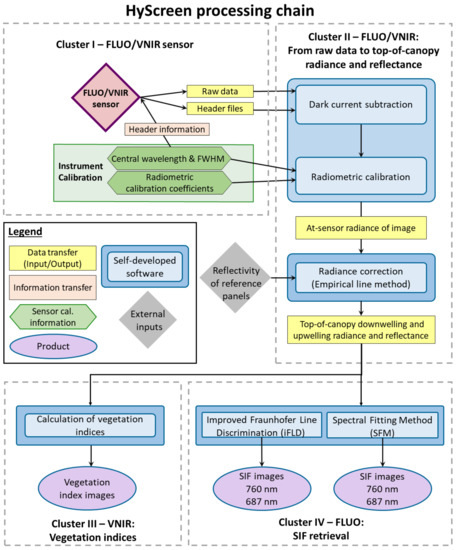 The HyScreen data processing chain consists of four clusters, as shown in Figure 3. The first cluster summarizes how spectral and radiometric calibration files complement the raw data consisting of the hyperspectral data cubes and header files. The second cluster describes the transfer of raw hyperspectral image cubes recorded by the VNIR and FLUO modules to TOC downwelling radiance, upwelling radiance and reflectance. Self-developed software using MATLAB 2021a [27] is used for dark-current subtraction, radiometric calibration and Empirical Line Method (ELM) correction [29], converting at-sensor radiance into TOC radiance and reflectance values as seen in Section 2.4.1 and Section 2.4.2. The third cluster calculates vegetation indices from data recorded by the VNIR module Section 2.4.3, while the fourth cluster includes SIF retrieval at 687 and 760 nm based on the two methods: improved Fraunhofer line discrimination (iFLD) and the spectral fitting method (SFM) Section 2.4.4.