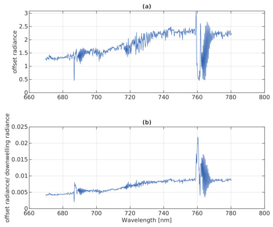 In Figure 4a, we can observe the upwelling radiance offset from 670 to 780 nm derived with the ELM from the 5% and 20% panels in Figure 2. Due to the low downwelling radiance in the oxygen absorption features, the offsets within the (1 mW m sr nm) and (1.5 mW m sr nm) bands are distinctly smaller in comparison to the wavelengths located on the shoulders of both absorption features. Consequently, the ratio of offset-to-downwelling radiance differs within and outside the absorption wavebands, which leads to an infilling feature similar to SIF, as shown in Figure 4b. We can observe that the infilling at is larger than at . The offset can lead to around 0.50 and 0.36 mW m sr nm error in SIF retrieval, respectively. Thus, considering the current optical characterization of the system, the ELM correction of the offset radiance is significant for SIF retrieval.