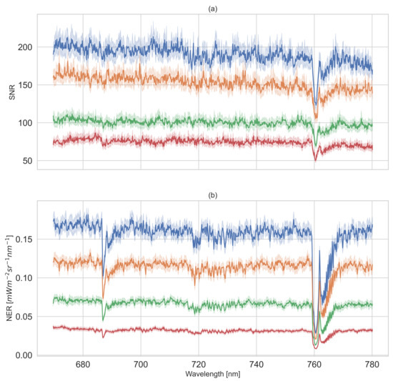 As SNR is crucial for assessing the sensor’s suitability to retrieve SIF, in this section, we present the methods used to estimate SNR and NER. For a specific ROI, according to [37], SNR is calculated for each wavelength using Equation (3).