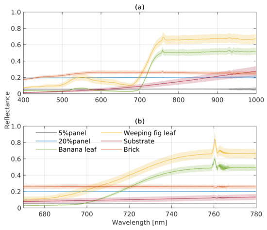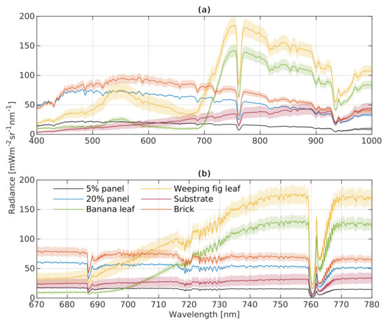 The FLUO module and VNIR are slightly different but complement each other for vegetation monitoring. Figure 6 shows the radiance spectra and corresponding standard deviations of the ROIs of each target shown in Figure 2. The radiance spectra of the FLUO module (Figure 6b) are slightly lower than those measured with the VNIR module (a). For example, upwelling radiance of the banana leaf at 750 nm recorded with the VNIR module is 12.07 mW m sr nm higher than that of the FLUO module, which corresponds to a 8.93% difference between both modules. In contrast, apparent reflectance is only 1% higher, representing a 2.28% difference, as shown in Figure 7. Meanwhile, VNIR and FLUO both show typical vegetation spectral patterns from banana and weeping fig leave, where green and infrared wavelengths are reflected stronger than those in the red range. The FLUO module has a deeper radiance signature and a sharper apparent reflectance signature than the VNIR module at and , which indicates the FLUO module can be used for SIF retrieval and VNIR can be used for vegetation traits retrieval due to its wider wavelength range. Between the ROIs, the banana leaf, weeping fig leaf and substrate are more heterogeneous than the brick and panels, as represented by their standard deviations.