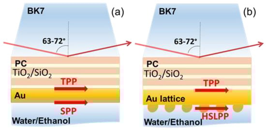 Scheme of excitation configurations of the PC(TiO2/SiO2)/Au structures for generating the TPP-SPP (a) and TPP-HSLPP (b) modes by spectroscopic ellipsometry in total internal reflection (TIR).