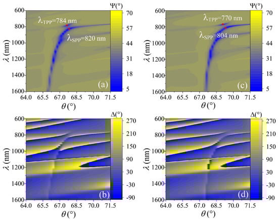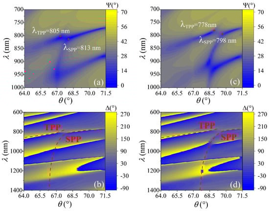 The dispersion maps λ (θ) of ellipsometric parameters Ψ(°) (a,c) and Δ(°) (b,d) for structure PC (TiO2/SiO2 (110 nm/200 nm)/Au (50 nm) in water (left side) and in ethanol (right side). The red points show the strong coupling effect between the Tamm plasmons and the surface plasmon at zero detuning.
