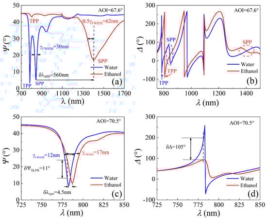 The TIRE method was used for the analysis of the optical properties and sensitivity features of the TPP-SPP hybrid modes. As was noted above, two different areas of a sample were investigated: one with a uniform gold layer and another with a nano-bumps array produced by DLW. The TIRE spectra of ellipsometric parameters Ψ and Δ were measured on the sample with non-modified thin metal film and maps presented as wavelength dependence on the AOI (θ = 64–72°). Figure 2 shows the hybrid TPP-SPP mode excitation generated on 1D PC and uniform thin gold film on the top when ambient was deionized water and ethanol. As can be seen from the dispersion maps λ (θ) of ellipsometric parameters Ψ and Δ, the strong coupling effect between the Tamm plasmons and the surface plasmon at the zero detuning point excited at 784 nm and 820 nm in water, and 770 nm and 804 nm in ethanol, respectively. For the hybrid TPP-SPP modes, the SPP component of ellipsometric parameter Ψ become narrower due to the anti-crossing which lies in the λ = 780–800 nm spectral range for the angle of incidence θ = 67–69°. It has been shown that this narrowing of resonance is related to decreased losses of the hybrid plasmonic modes and strong coupling between Tamm and the propagated surface plasmon polaritons, described reasonably well by the simple two coupled oscillators model []. The maps of the ellipsometric parameter Δ show sharper dispersion lines of the resonances (Figure 2b,d). The hybrid plasmonic excitation of the TPP and SPP at a fixed angle of incidence (θ = 67.6°) was λTPP = 783 nm and λSPP = 843 nm for the deionized water and was λTPP = 801 nm and λSPP = 1401 nm for the ethanol at the same AOI. The shifts were δλTPP = 18.2 nm and δλSPP = 559.7 nm in the different ambient. The spectral shift of TPP and SPP resonances was caused by the refractive index change of the ambient δn(λ=783nm) = 1.3495 − 1.3286 = 0.0209 and δn(λ=843nm) = 1.3486 − 1.3276 = 0.021, respectively. The refractive index values for deionized water and ethanol were taken for CompleteEase ellipsometric software database []. Spectral shift of these resonances gave the corresponding sensitivities to the refractive index unit (RIU) δλTPP/δn = 18.2/0.0209 ≈ 871 nm/RIU and δλSPP/δn = 559.7/0.021≈26 600 nm/RIU. It should be noted that the sensitivity of the conventional SPR sensor with a single thin (~50 nm) gold layer on the glass prism base to refractive index of the ambient was about 19,000 nm/RIU when the ambient was changed from deionized water to ethanol (the results not shown). This number is higher than earlier reported for wavelength investigation (13 800 nm/RIU) [].