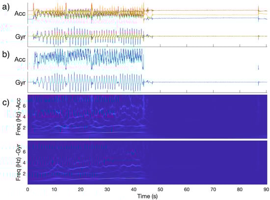 (a): Raw IMU signals for a control subject performing the finger-nose-finger task with their right hand (one color per component). (b): Signals projected along first principal component. (c): Magnitude of synchrosqueezed transform (SST) of projected signals. Note: During the right half of the graphs, the measured hand was at rest. On the left-hand side, a noticeable feature is the group of horizontal lines around 1 Hz, which is the approximate frequency with which the subject completed the repeated motion.