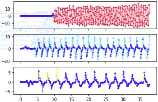 An example time series in which each time point in a preprocessed gyroscope signal has been assigned a learned latent state (state represented by color). (Top): alternating hand movements task (subject with mild ataxia). (Middle): finger-nose-finger (control subject). (Bottom): finger-nose-finger (subject with ataxia).