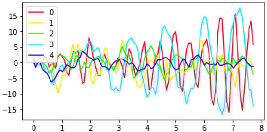 Sample trajectories evolving according to the estimated AR parameters  for each of the five states. Visual inspection of such trajectories are a simple tool to help add insight about the types of movement corresponding to each state. For instance, the sample trajectory from state 0 exhibits the kind of very fast oscillations that were more common in the alternating hand movements task in control or mildly ataxic subjects than in subjects with higher BARS scores.