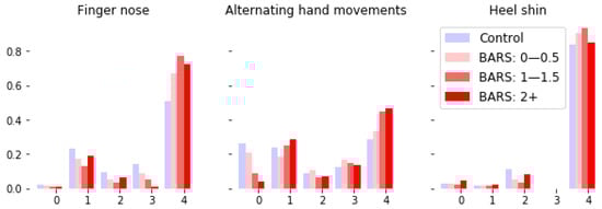 The performance of the classifier on these features is comparable with the best performance we have seen in the literature. In related work applying a time-frequency approach to rhythmic tapping, an AUC of 0.90 was reported for classifying ataxia vs. controls []. Research conducted simultaneously with the present work that involved decomposing reaching movements reported an AUC of 0.96 and 0.89 for classifying ataxia vs. control and ataxia vs. Parkinsonism, respectively []. We did not encounter movement data-based classifications of different types of ataxia (e.g., MSA vs. SCA 3) in the literature that are comparable to ours. We compared our severity estimation results to another very recent work [] which used gait analysis and reported a  value of 0.72 for total BARS prediction and 0.45 for upper extremity BARS score prediction (that is, a higher  value for the total score than we found using our approach, and a lower score for the upper extremity, as might be expected for a gait-based analysis).
