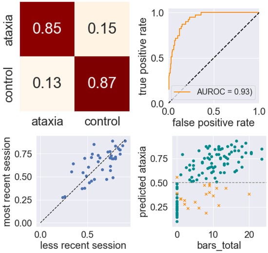 Classification performance on distinguishing ataxic subjects from control subjects. From left to right and top to bottom: normalized confusion matrix (rows show true classification, columns show prediction); ROC curve; test–retest correlation of classification scores, with scores closer to 1 representing the prediction of ataxia and scores closer to 0 the prediction of control; Total BARS score vs. predicted probability of ataxia (>0.5 corresponds to a prediction of ataxia,  = incorrect prediction).