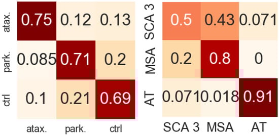 We assessed the applicability our feature set to the task of distinguishing between different types of ataxia. In the task of classifying ataxia–telangiectasia (AT), multiple system atrophy (MSA), and spinocerebellar ataxia type 3 (SCA 3, the most well represented of the SCAs in our data), we obtained an accuracy of 0.80. (Figure 6).