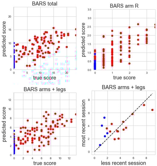 From Top left: true vs. predicted total BARS scores; top right: true vs. predicted BARS right arm subscore; bottom left: true vs. predicted BARS arm and leg subscores; bottom right: test–retest reliability of BARS arm and leg subscores for subjects with multiple visits (red = ataxia, blue = control).