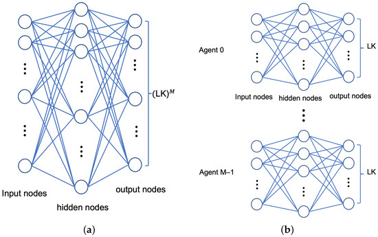In DQN, the state is fed to input nodes of ANN and each output node of ANN is dedicated to each action. As introduced in (8), a state is defined by a -tuple vector, which are entries of and M entries for each of and . Each M D2D link can be allocated a channel index and a power level out of K and L possible values, respectively, so that there exist possible realizations of action at each time step. It follows that ANNs in the prediction network and target network have input nodes and output nodes, as shown in Figure 3a. Suppose ANN has hidden layers, each of which has nodes. We also suppose neighboring layers are fully connected. In the testing phase, ANN performs the forward propagation from the input layer to the output layer. We consider the computational complexity of the forward propagation of ANN in terms of floating point operation (FLOP) [35]. A forward propagation from a layer with nodes to a layer with nodes requires approximately FLOPs where the computational complexities of the activation functions of nodes are negligible. Then, FLOPs required for forward propagation over ANN is approximately . In the training phase, ANN is updated through multiple pairs of forward and backward propagations. It is known that FLOPs of backward propagation are typically 2–3 times the FLOPs of forward propagation [35]. Thus, it is sufficient to focus on forward propagation when comparing computational complexities of ANNs. When L, K, and M are high, is much higher than and so that the computational complexity of ANN is dominated by . Since FLOPs are too high to be executed in real time, the RA scheme based on a single-agent DQN is practically infeasible with high L, K, and M.