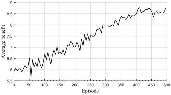 Evolution of average benefit for [bit/s/Hz], [m] and , where average values of benefit over every 5 episodes are plotted.